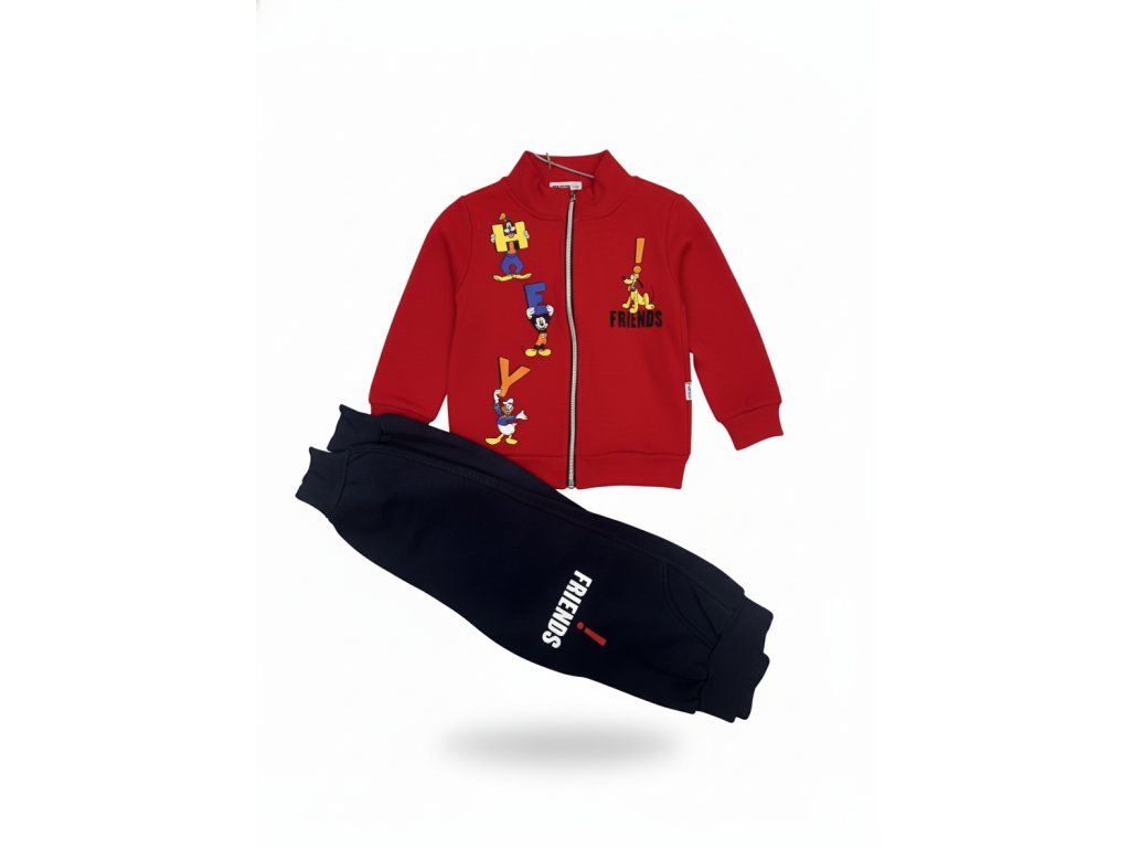 Bunda: Mikina na zips v sýtej červenej farbe. Prednú stranu zdobia postavičky Mickey Mouse, Donald a Goofy, doplnené nápisom "FRIENDS" a hravými motívmi. Stojatý golier chráni pred chladom.