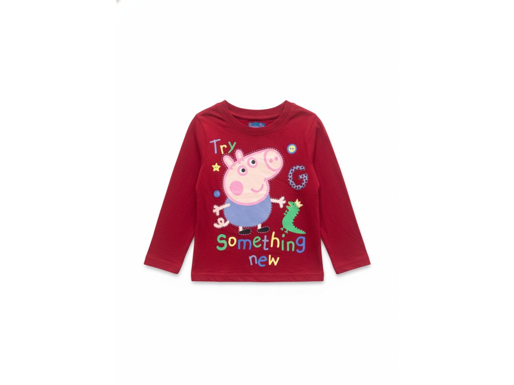 Tento veselý a pohodlný chlapčenský dlhý rukáv v sýtej červenej farbe je ideálny pre všetkých malých objaviteľov! Tričko je zdobené prasiatkom Georgeom, jeho hračkou dinosauríkom a motivačným nápisom "Try Something New" (Vyskúšaj niečo nové).