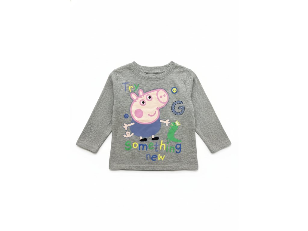 Tento veselý a pohodlný chlapčenský dlhý rukáv v univerzálnej svetlosivej farbe (melanž) je ideálny pre všetkých malých objaviteľov! Tričko je zdobené prasiatkom Georgeom, jeho hračkou dinosauríkom a motivačným nápisom "Try Something New" (Vyskúšaj niečo nové).