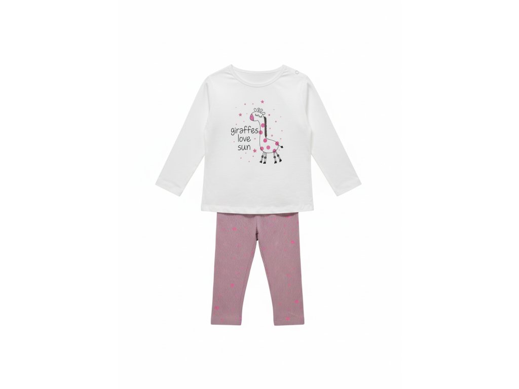Vrchný diel: Tričko s dlhým rukávom v čistej bielej farbe s potlačou v ružových a čiernych tónoch. Dominuje mu usmievavá žirafka a nápis "Giraffes Love Sun" (Žirafy milujú slnko).