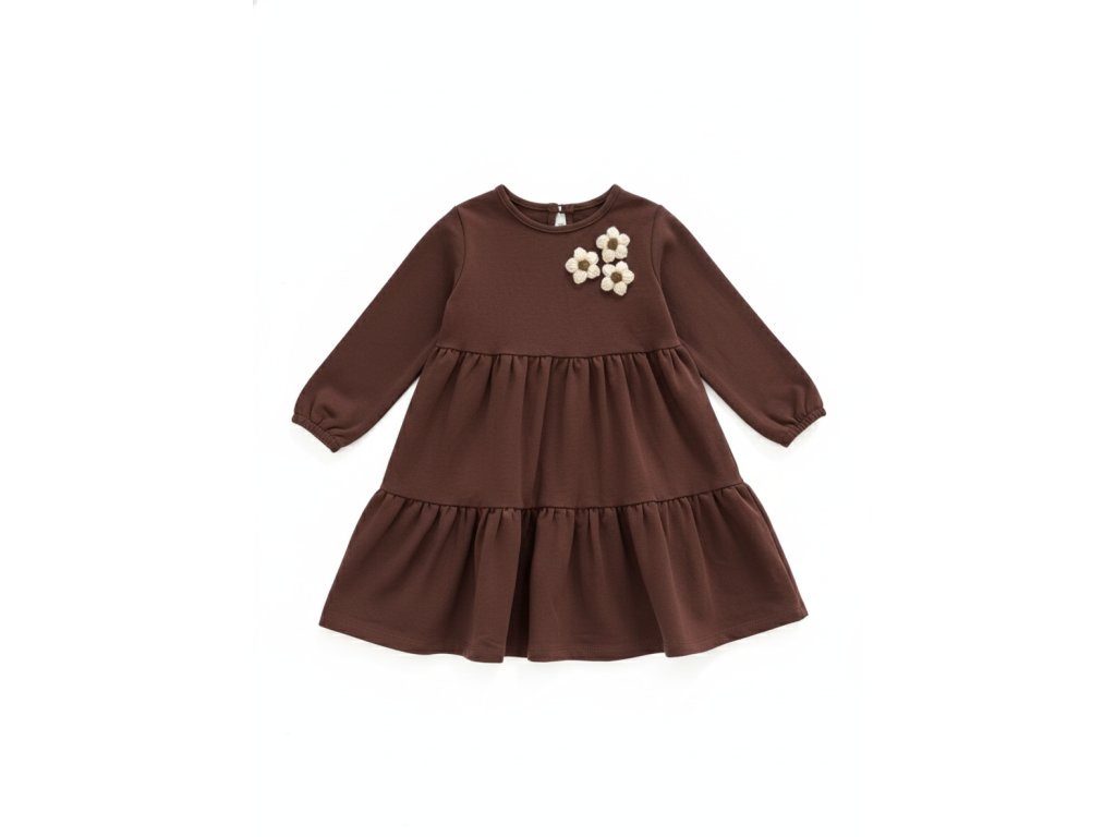Tieto roztomilé a pohodlné šaty v sýtej čokoládovo hnedej farbe sú ideálne na jeseň a zimu vďaka dlhým rukávom a zloženiu, ktoré zaručuje teplo. Hravé volány a kvetinový detail dodávajú šatám šarm.