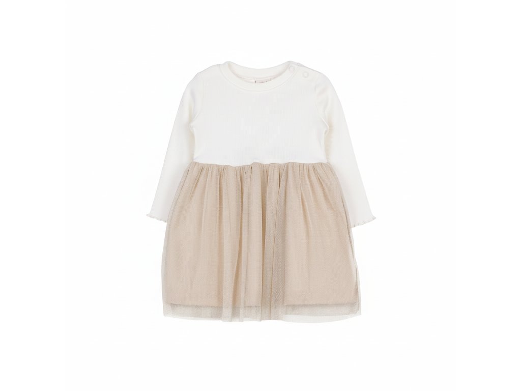 Tieto elegantné a pohodlné šaty v jemnej, neutrálnej kombinácii krémového topu a béžovej tylovej sukne sú ideálne na slávnostné príležitosti, rodinné oslavy alebo na elegantné bežné nosenie. Spájajú trendový rebrovaný top s nadýchanou tylovou sukňou.