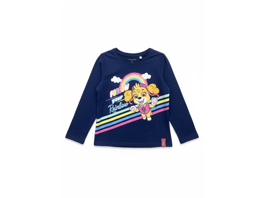 Tento štýlový a pohodlný dlhý rukáv v tmavomodrej (námorníckej modrej) farbe je ako stvorený pre malé fanúšičky odvážnej Skye! Tričko je zdobené motívom dúhy a motivačným nápisom "Follow your Rainbow" (Nasleduj svoju dúhu).