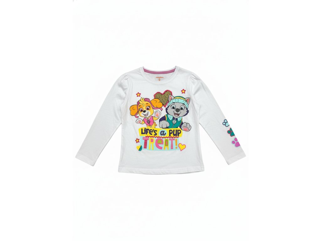 Tento rozkošný a pohodlný dlhý rukáv v čistej bielej farbe je ako stvorený pre malé fanúšičky Tlapkovej patroly! Tričko zdobia obľúbené hrdinky Skye a Everest a má hravý nápis "Life's a Pup Treat!".